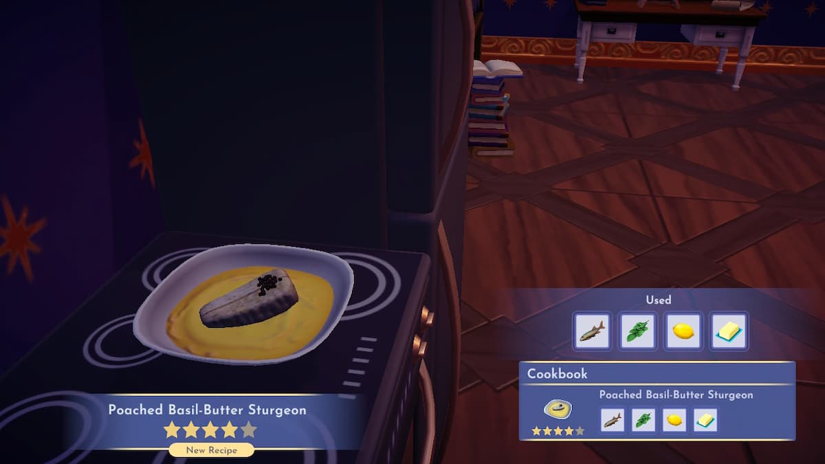 Poached Basil-Butter Sturgeon is considered to be a fancier dish and requires a total of four different ingredients. While some recipes allow players to pick and choose what ingredients they want to use, such as selecting between different fish, vegetables, or fruits, this recipe is one that has to be stuck to in order to make the desired dish.