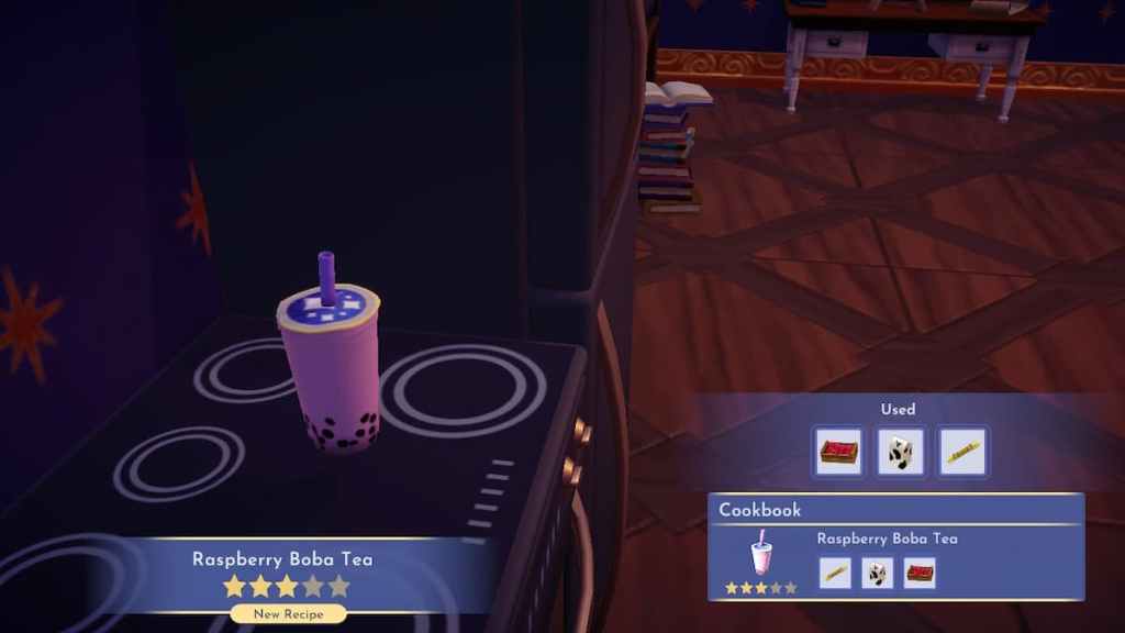 Disney Dreamlight Valley offers many different recipes, including Boba Tea. Not only can players make the simple, original Boba Tea, but it also offers many different flavors like Coconut, Gooseberry, and Raspberry. What is even more fun about each of these drinks is the colors change with each one, the Raspberry taking on a beautiful purple-pink color.