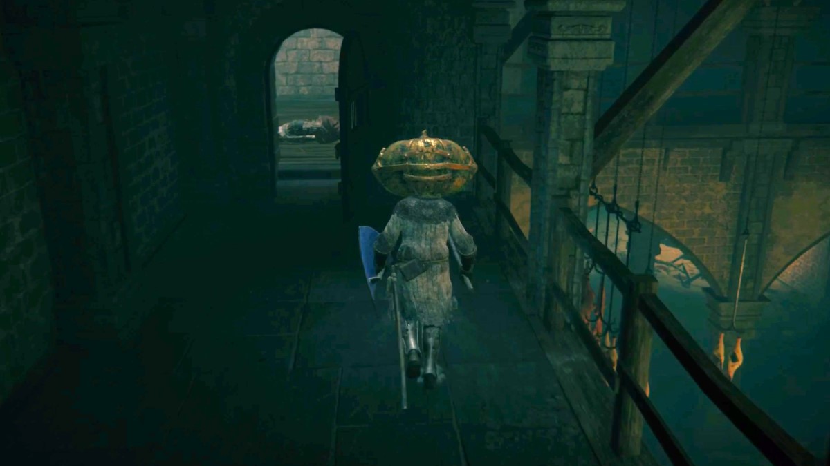 Starting on the locked side, go back along the balcony and turn right. You can either fight the knight in here, or you can run through to the doorway in the far corner (go across the raised platform to make it harder for the knight to get you). When you exit the room, immediately turn left and jump over the wall where the sandbags are.