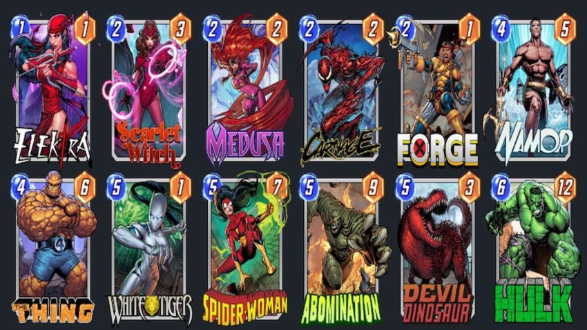 We built our own deck out of the cards featured in this guide. The ideal strategy would be to start with Elecktra or Medusa, then use Forge to power up Carnage or Scarlet Witch if necessary. Try to save Spider-Woman for a spot with three or four cards on the other side, and use Hulk, Abomination, and Devil Dinosaur to fill any gaps you see. Matches in Snap are over quickly, so stay focused and don’t get hung up on any one win or loss for too long.