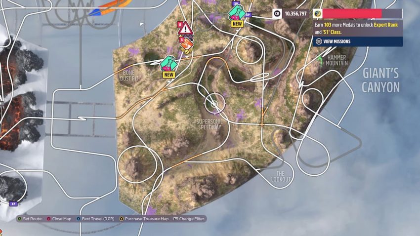 Supersonic Speedway can be found in the southwestern part of Giant’s Canyon, to the west of The Hammer Drop and Hammer Mountain. Here’s what it can be found on the map: