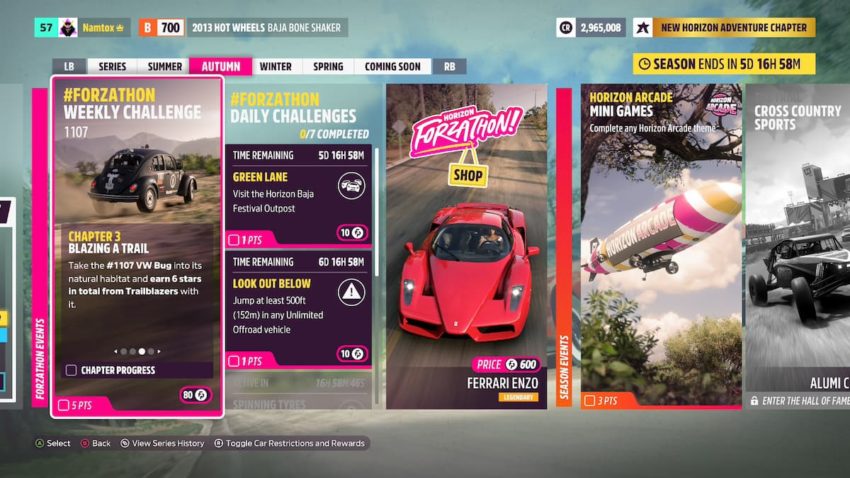 - Complete three Seasonal Championships (rewards are Bentley Bentayga, Toyota FJ40, Cherokee ’14, and 5 pts. each (15 pts. in total))