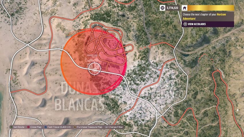 To complete this Treasure Hunt, you must complete a Cross Country race in any Dune buggy vehicle type. After completing the race, you will receive a treasure hunt circle on your map in the Dunas Blancas region. This Treasure Chest will be next to the Horizon Baja Outpost on the side of the road.