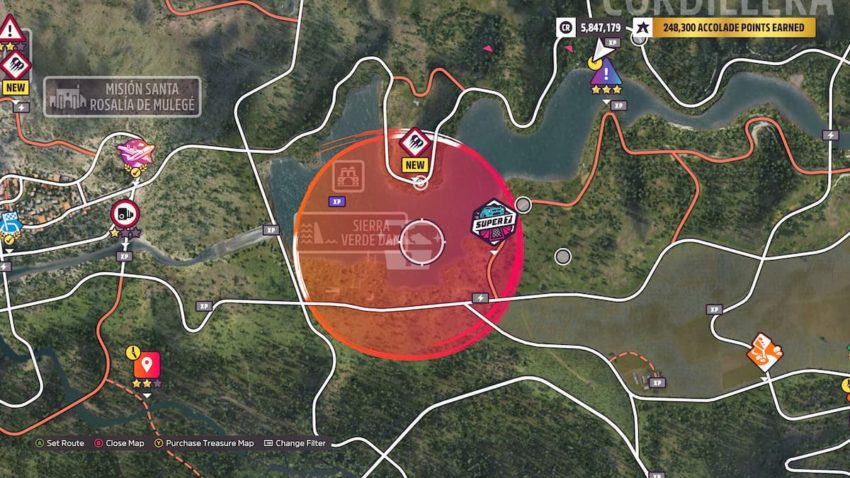 As you might have guessed, this Treasure Hunt challenge will require users to complete it while using a Porsche Spyder (ex. 2014 918 Spyder). From here, you will want to find the Salto de Rio Danger Sign. This sign is part of the Evolving World and can be found at Cordillera. Get 3 Stars at this Danger Sign.