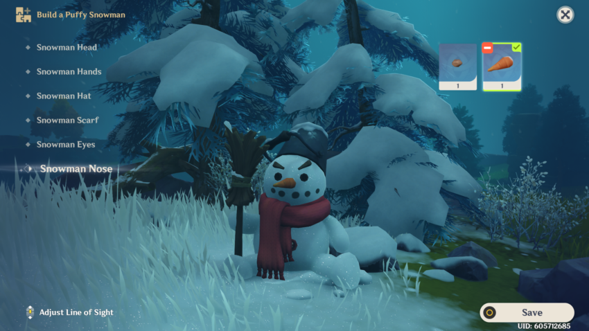 Once you interact with the snowman, you can start putting it together. All the snowman components you’ve earned throughout the Dragonspine Special Training will appear, categorized by different elements. You can collect special Snowman Heads, Hands, Hats, Scarves, Eyes, and Noses.