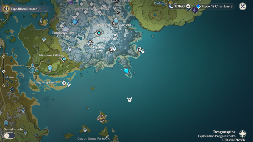 The Teleport Waypoint is at the eastmost point of Dragonspine, located in the water. There will also be a symbol to the left of the Waypoint, showing you where to go.