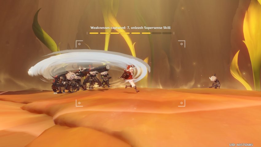 • 3 Feralgrass Shockwaves will randomly be unleashed at the position of opponents who have had their weaknesses exposed, dealing AoE Dendro DMG. Opponents with more than 2 weaknesses spotted will be prioritized for attack.