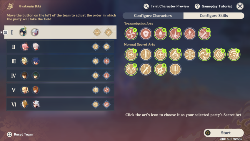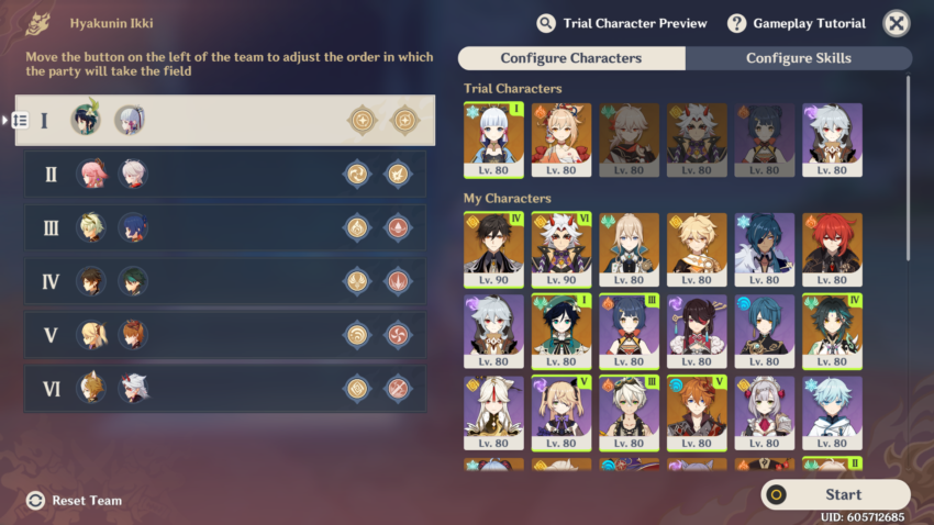 When drafting a team, you can choose from a list of trial characters and your own characters. The trial characters you can use today are Ayaka, Yoimiya, Kazuha, Arataki Itto, Xiangling, and Razor. Assemble your strongest team, and then click the “Configure Skills” tab.