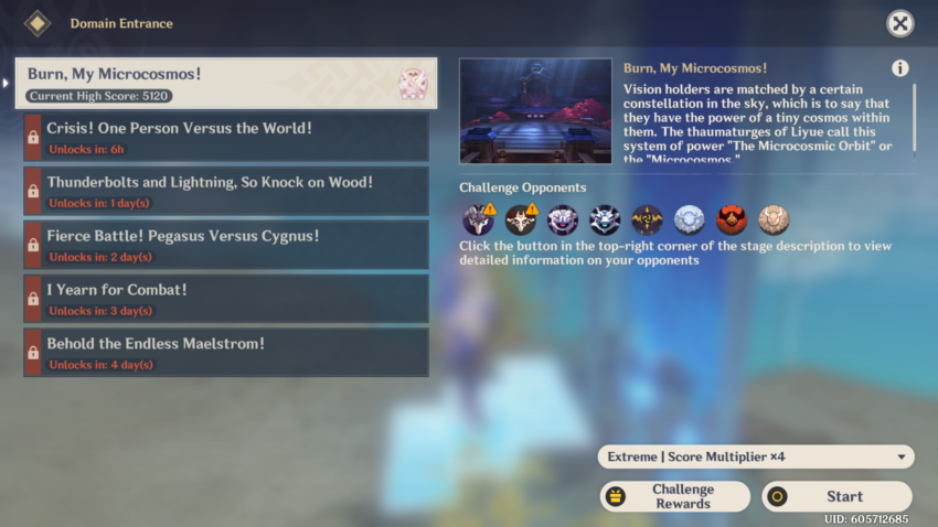 Every day a new challenge is available for players to take on. These challenges differ in the enemies that you can face, so you may want to plan your team accordingly based on what you’ll have to fight. (For example, the third day will feature some Hydro Slimes and Hydro Abyss Mages, so you may want to consider some Cryo units to freeze them.)