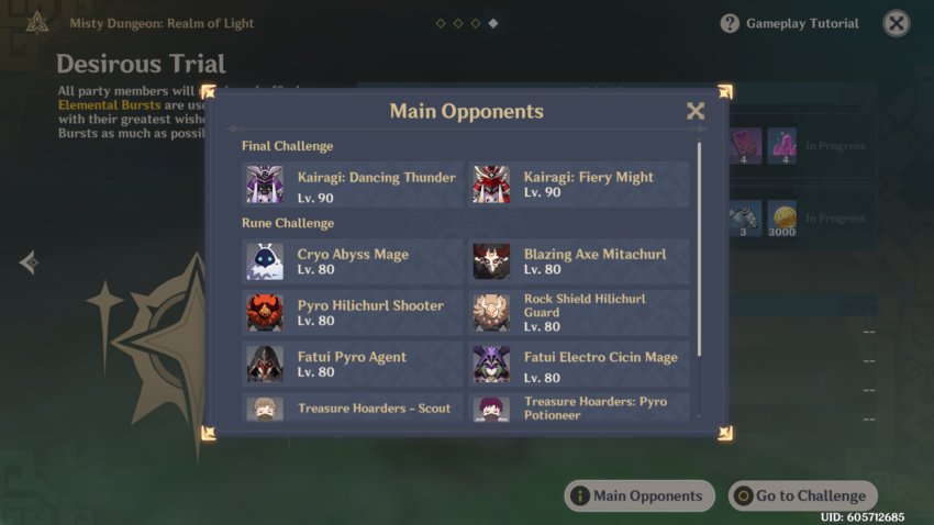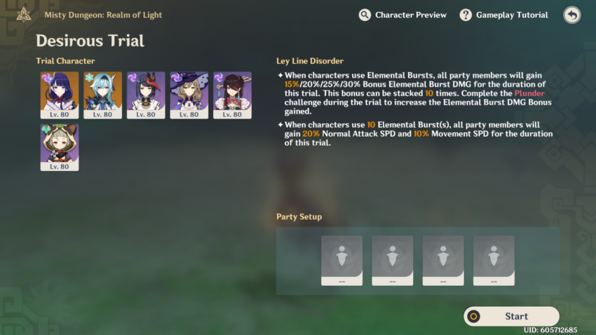 In the Misty Dungeon: Realm of Light dungeons, you can only use from a pre-selected group of characters. Different characters will arrive for different trials. This is a fun way to try out some new characters that you haven’t acquired yet. (Note: to match the power level of your characters, if you already own a character featured in the event, their constellation level will match yours.)