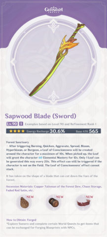 Sapwood Blade is a 4-star sword, which means that it has fairly decent stats for its user. Its base ATK value is 44 at level 1 and becomes 565 at level 90. Its secondary stat is Energy Recharge, which helps with Energy regeneration of the wielder and starts at 6.7% at level 1 and grows to 30.6% at level 90.