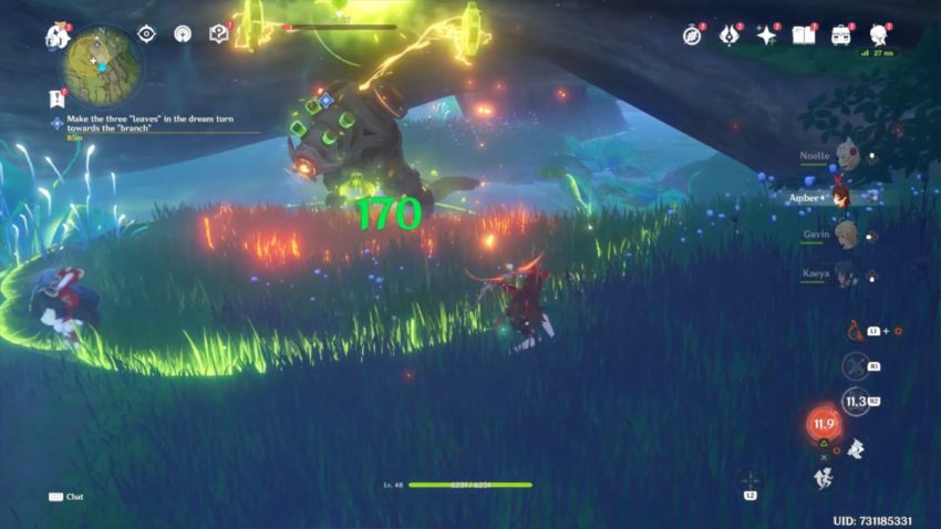 Follow the marker and when you reach the quest area, find the entrance to the Grove of Dreams on the north side. It’s basically a hole in the ground next to a small stone circle. Glide down into it, then follow the tunnel to the marked location. There, equip your Vintage Lyra and play the Rhythm of the Great Dream. This is the song you first played during The World of Aranara quest, and you play it in the same way here. Remember to raise the key, and don’t worry about playing the notes rhythmically.