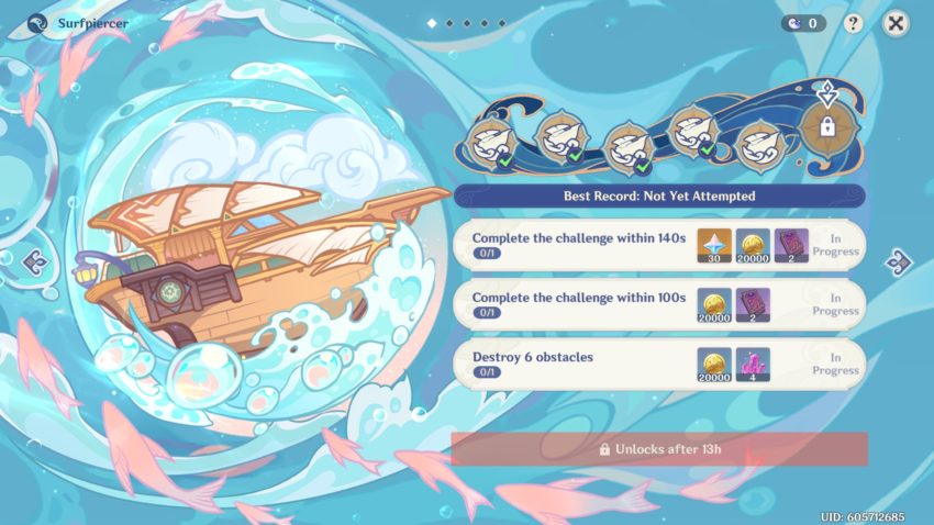 There are a total of six Surfpiercer courses. Each course has a minimum completion time which will grant you 30 Primogems, but if you fulfill all of the requirements, you can earn extra Mora, Hero’s Wit, and Weapon Enhancement Ores. Be sure to fulfill all the requirements possible so you can maximize the number of rewards you get.