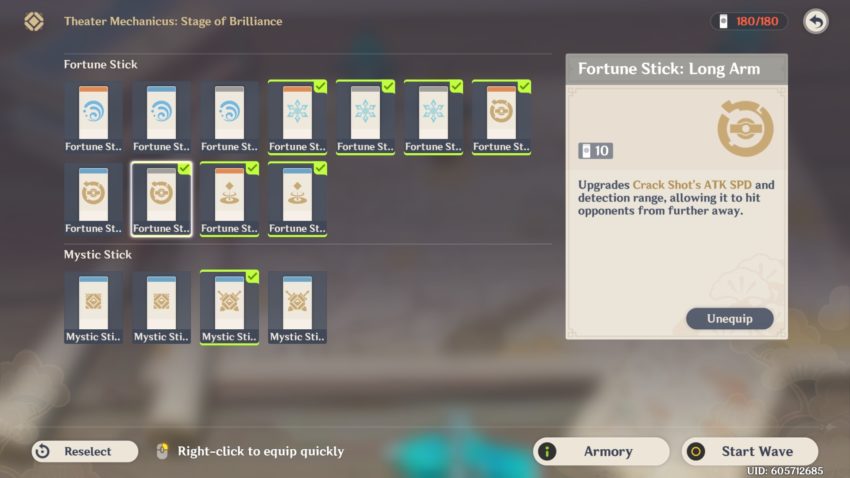 The Fortune Stick mechanic returns to the game as well, granting your turrets certain buffs. However, these are no longer randomly generated, and you can choose which ones you’d like to take from a predetermined list. Here are the buffs we used for this stage: