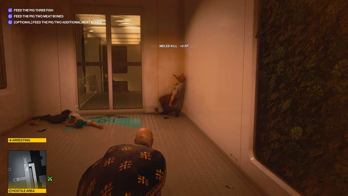 You need to use the fish wire to garrotte the first NPC wearing a white pig mask in this room. You can store his body in the container nearby. First, ensure that the other NPCs in the room don’t spot you, or this will ruin your Silent Assassin rank. Next, pick up the fish and gun that the NPC dropped.