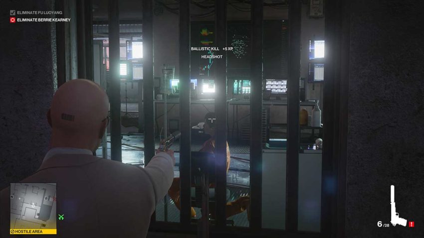 Go across this walkway and get to the opposite side of the wall to where your target is. There are four researchers that you now need to dispatch. You need to open one of the doors either side of the window and flip a coin. This will distract a researcher and draw them out. Once they’re outside, distract them again to a position in which you can subdue them.