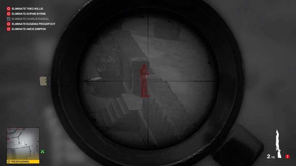 Your third target is more complex than the first two. Drop your sniper rifle on the balcony. You’ll return for it later. Go down the ladder and make your way over to the greenhouse, where your third target is smoking unhelpfully close to a potential witness.