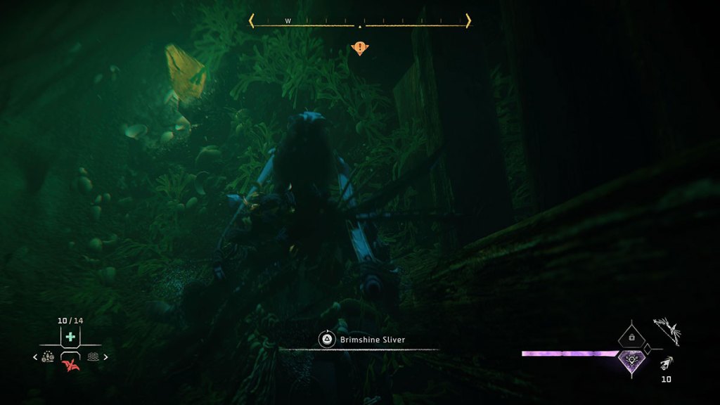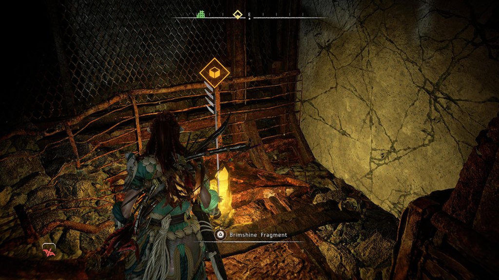 There are 2 Brimshine Slivers worth 1 Brimshine in the His Final Act quest in the Horizon Forbidden West: Burning Shores DLC. The first can be found at the bottom of a drop just as you awaken the second Horus tentacle. When Aloy says she and Seyka need to hug the cliff, drop down the hole ahead of you to find this Brimshine Sliver. See above for a map reference for this Brimshine Sliver.