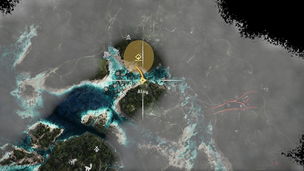 Three Brimshine locations are stretched across the Heaven and Earth quest in the Burning Shores DLC. The first one is underneath a bridge close to where you land at the beginning of this quest. Use Aloy’s Focus to look around, and you should see the Birmshine Fragment poking out from under the bridge to the next island. See above for a map reference for this location.
