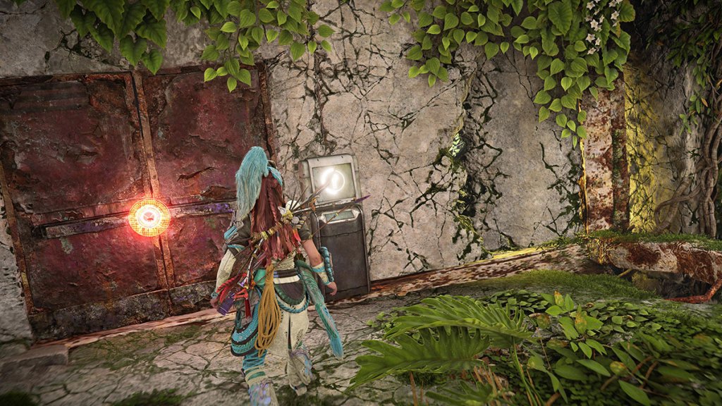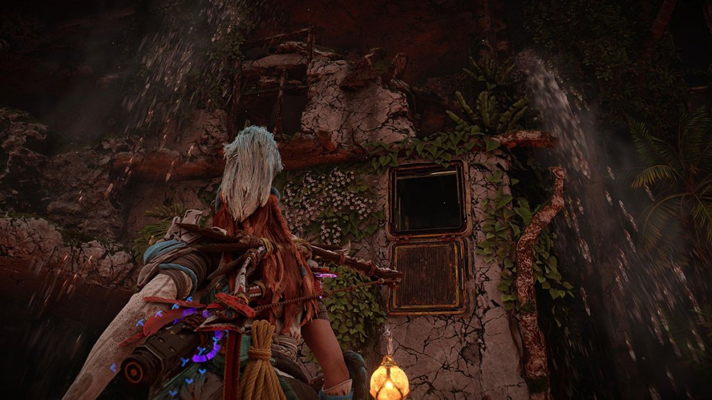 There’s a vent above the waterfall that Aloy can use her Pullcaster on to zip to and break open. You’ll find the Key Module inside, but it’s not immediately apparent what this is used for.