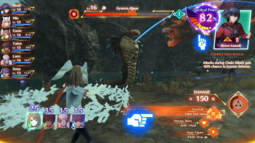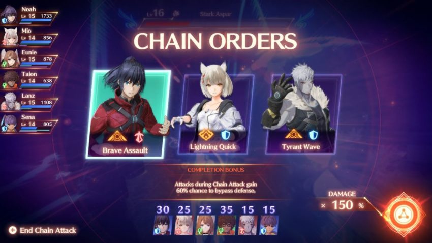 When the new menu appears, you will see three of your characters in the center of the screen. Each one will have the name of the attack they will perform at the bottom of their picture. When one of the Chain Orders is highlighted, you will get the information about what bonus the move provides. For instance, Noah’s Chain Attack move bonus allows 60% of the attacks to bypass the enemy’s defense. When you decide what move you want to perform, select it with the A button to start the attack.