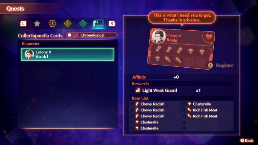 You will also see how much Affinity and experience you will gain from completing that request, along with potential items they may give you. If you have what they want, you can hold A to register the card and complete the quest from anywhere in the world.
