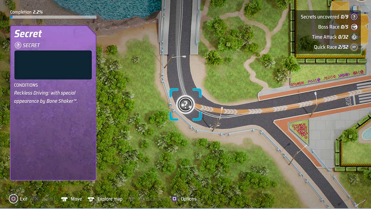 This clue tells you what you need to do to unlock the Secret. You must complete the Reckless Driving event using the Bone Shaker car. All you need to do is acquire the Bone Shaker car by purchasing or unlocking it and then use it in the Reckless Driving event. This will unlock the Secret, a reward, and a new path to explore in the world. There are a total of nine Secrets to discover and complete in the game world. Most have a clue like this, but some are more obscure and require a bit more thought on your part to figure out what car and event combination you need to create to unlock them.