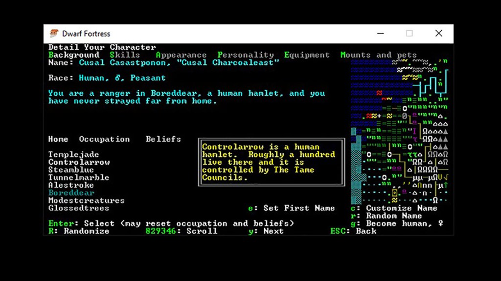 Players will first need to have a world that has been generated in an available world slot in Dwarf Fortress. Select that world in the main menu, then select ‘Adventure.’ Developing worlds with longer histories, such as 250 years and above, may pay dividends in this game mode, as there are typically far more interesting rivalries and lost settlements over time. This will not impact gameplay and is likely immaterial for those not interested in the developed lore.