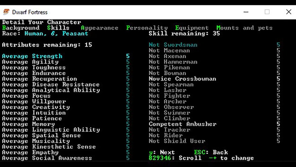 Hopefully, you were paying attention during the generation of the world — war-torn regions can be a difficult start, as can areas plagued with necromancers and the like. Using Dwarf Fortress Legends Mode can help decipher what’s going on in your world before diving into Adventure Mode. Once you’ve determined where to begin, players will then need to determine who they are, including stat rolls, their beliefs, and what they are bringing on the adventure. From there, the exploration begins.