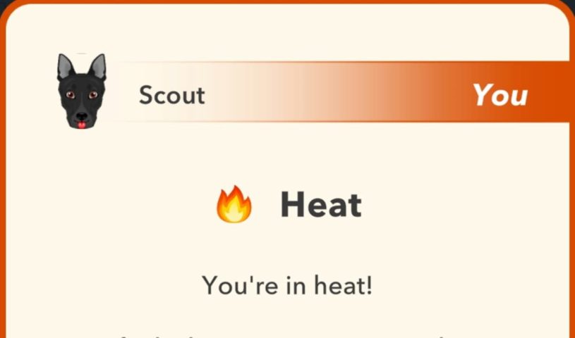 After the initial reaction, you’ll see an In Heat! notification at the top of your screen whenever your female dog enters Heat. From what we can tell, there’s a higher chance of you leaving your scent in the Activities tab to attract male dogs to your location. The Heat icon will appear every so often, so if you’re trying to have puppies with another male dog, you’ll want to wait for that icon to appear to have the best chances of it.