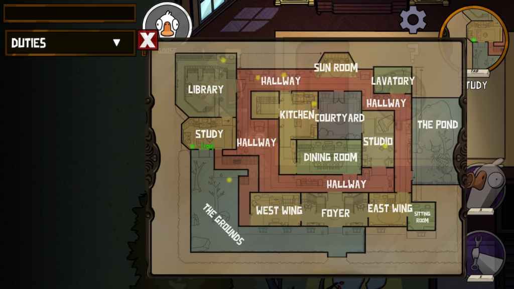 As you might imagine, Mallard Manor takes place in a dark manor. You can make your way out to grounds for fixing sabotages and completing tasks. There are no vents on this level, but people can hide in leaves and cabinets.