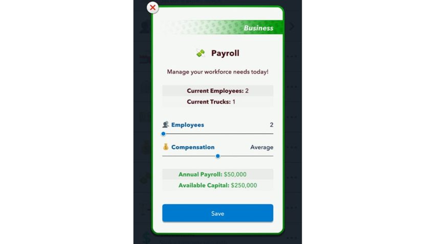 You can visit payroll by going to the job menu and scrolling down until you see the Payroll option. Tap on it to get a pop-up showing you your payroll. Here, you’ll be shown a few different stats but the ones that you want to keep an eye on are: annual payroll, available capital, and compensation. Annual payroll is how much you pay your employees every year and your available capital is how much you’re able to spend. Compensation is how much you’re paying your employees. Sliding the button up or down will increase or decrease their wages respectively. The scale goes from dirt cheap to low, then average, above average, and finally big bucks. By decreasing compensation, you will see your annual payroll decrease while your available capital will increase. Increasing compensation though will have your annual payroll increase while your capital decreases.
