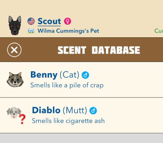 After successfully sniffing that animal, you’ll have a unique odor added to your Scent DB. You can refer back to the animal and what it smelled like by visiting your Scent DB page. The page displays the animal’s name, the type of animal they are, and the kind of scent they have. If an animal is no longer in your life, you’ll see a question mark next to their icon. Click on the animal if you want to read their profile, and for some, you’ll have the option to locate that lost animal. If you find them alive and well, you’ll receive the achievement The Nose Knows.