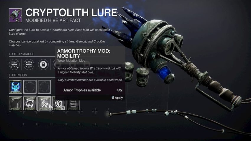 There are various activities you can complete to earn more lure mutations for your Cryptolith Lure. You can complete Strikes, Gambit matches, Crucible matches, and even specific Wrathborn hunts will drop mutations if they have it available as a drop, rather than a weapon or armor piece.