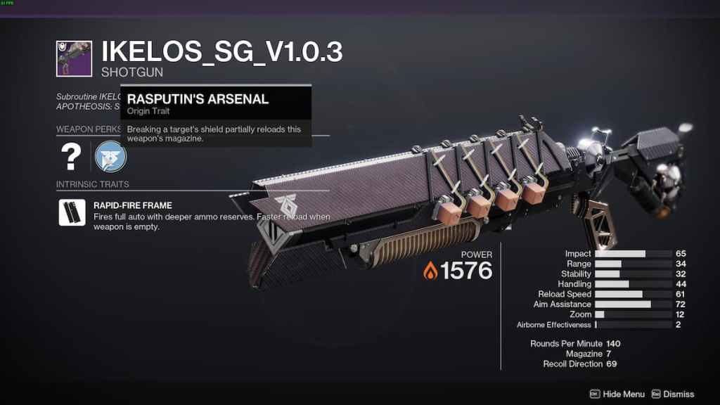 The Rasputin’s Arsenal Origin Trait belongs to the Season of the Seraph Ikelos reprised legendary weapons. You must own Season 19: Season of the Seraph to earn these classic weapons. These are the weapons that feature this Origin Trait.