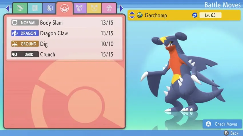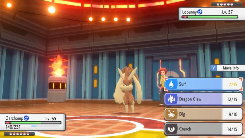 Your best choice of Pokémon against Flint shouldn’t simply be your strongest. As the goal is now to use as little as possible, one that can be effective against all of Flint’s party is Garchomp. As shown above, we applied TMs Dragon Claw and Dig to the Pokémon to make it super effective against each of the Fire and Steel-types. Better yet, this Dragon-type is surprisingly able to learn various Water-type moves like Surf and Rain Dance.