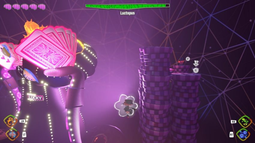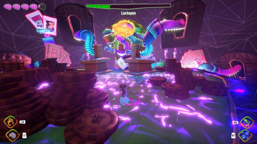 This is when it gets a little tougher. A handful of cards will block the bombs you’re sending to the tentacle to the left. In addition, Lady Luctopus will be sending a volley of attacks your way, so use the dodge roll when you can by pressing B (or the circle button on PlayStation systems). You should also watch the red lines on the ground so you can track where the cards will hit once they’re thrown towards you. After attacking the left tentacle twice, you’ll save two more interns. She’ll initially block your way up to her head with the cards, but she’ll relinquish them after a few seconds. Zoom your way up and be snappy as she’ll attack you as you’re trying to PSI blast her blockade.