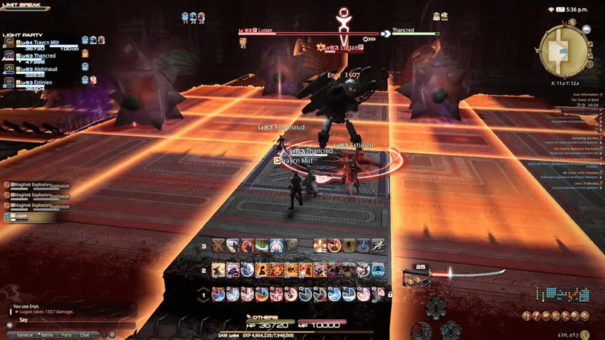 The other attack you have to watch out for is Magitek Explosive. Lugae summons three large bombs that appear on the edge of the arena. These bombs will create a cross-formation AoE, meaning you’ll want to find the location in the room without a bomb and stand there. Then, if your tank can bring Lugae to that location, you can continue to attack it from there.