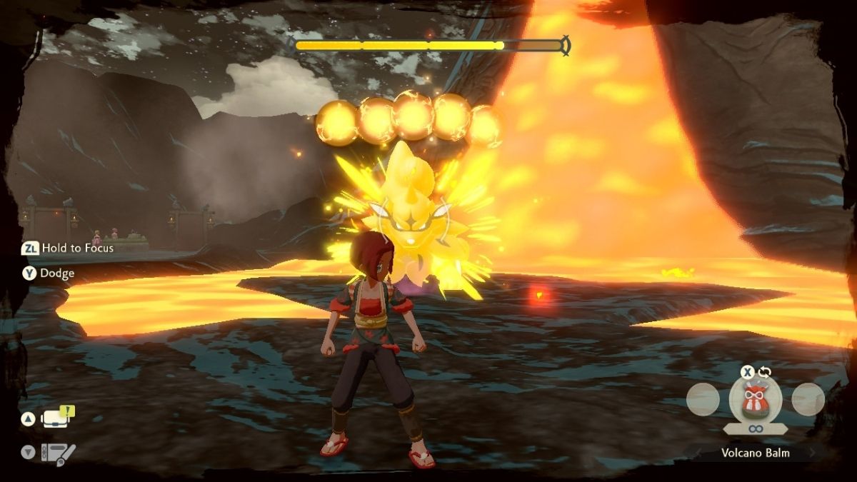 During the Arcanine fight, try to stick to the sides of the arena and hit Arcanine with balm from afar. Dodge toward Arcanine when he charges to avoid damage. If you are in the center of the arena, stick to a side and dodge backward to avoid taking damage from his AOE jump attack. When you see the orbs appear over Arcanine’s head, hit him with as many balms as you can. This will prevent the attack from happening and stun Arcanine.