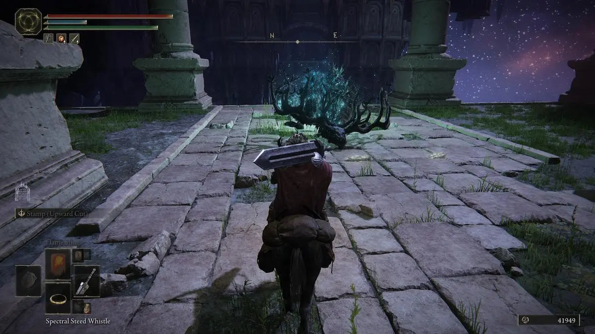 Once you light all six flames, head over to Hallowhorn Grounds, shown above in the northeast area of the map. You’ll see a large skeleton of a deer glowing. Interact with it, and you’ll be taken to a cave. You’ll spawn next to a Stake of Marika, and ahead will be a Mist Gate leading to the boss.