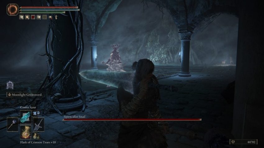 You can find the Spiritcaller Snail in the Liurnia region to the north of Limgrave. You can reach this area by going through or around Stormveil Castle. Once you reach the area, go to the northeast side of the lake. You will find some land that you can use to get out of the lake. From there, go south and locate the jellyfish spirits near the cliff. Follow the cliffside down to the Road’s End Catacombs. At the end of the catacombs, you will fight the Spiritcaller Snail boss.