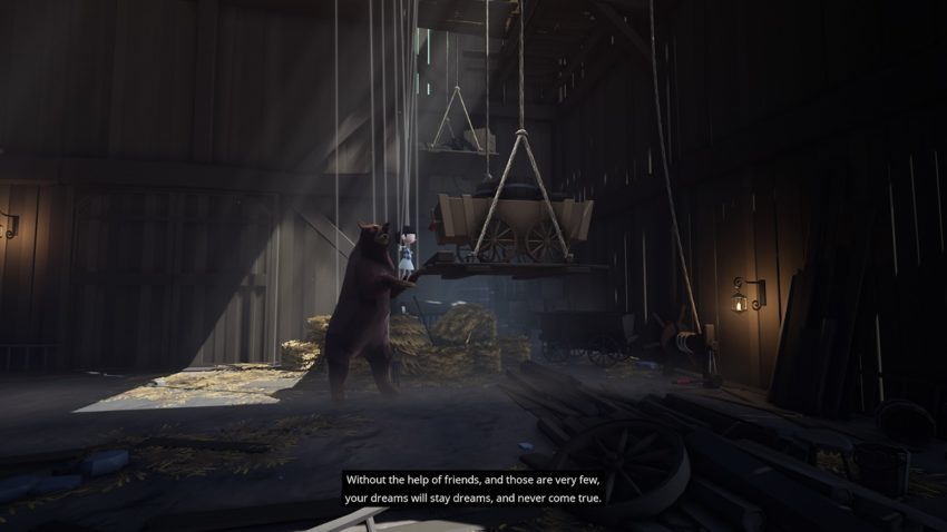 You’ll realize soon after that you’ll need the bear’s help to get past the cart’s platform. It will then lend a paw. Jump onto it and over the cart to the other side. You’ll see a lever with a red pattern on the end of it. Grab it and then the cart will collapse on the ground. Get on the other side of the cart and push it. The bear will come in to assist you.
