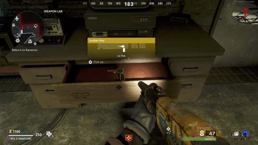 With the eye in your inventory, go back to Weapon Lab and interact with the computer to the right of where you grabbed the blueprint. It should say, “PROVE YOU ARE ME.” Interact with it to put the eye in the retinal scanner and open a drawer with a locker key in it. Grab it and go to the Barracks.
