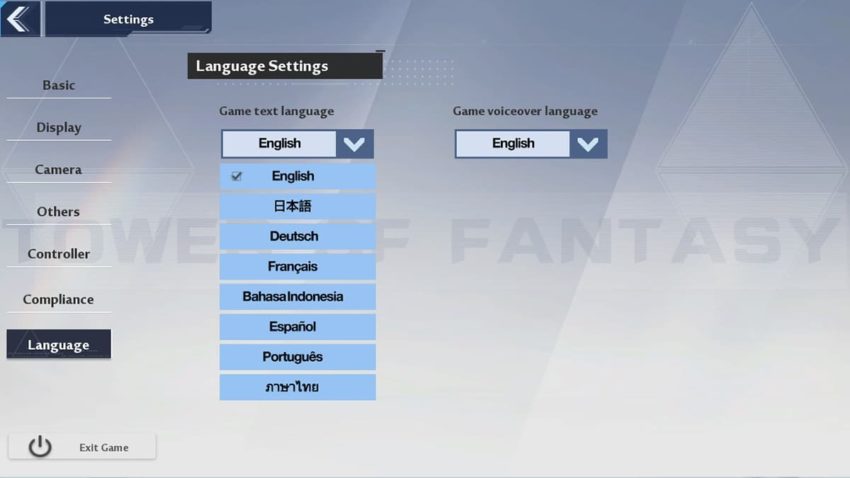 Changing the language used in Tower of Fantasy is very simple, but it is a little limited. Start by logging in and entering the game. Before entering a server, you can open the Settings menu and go to the Language section. There is nothing complicated here, just the game text and audio voiceover language having its choices laid out for you when you click their drop-down menus. After you make your choice, restart the game for the language changes to take effect.