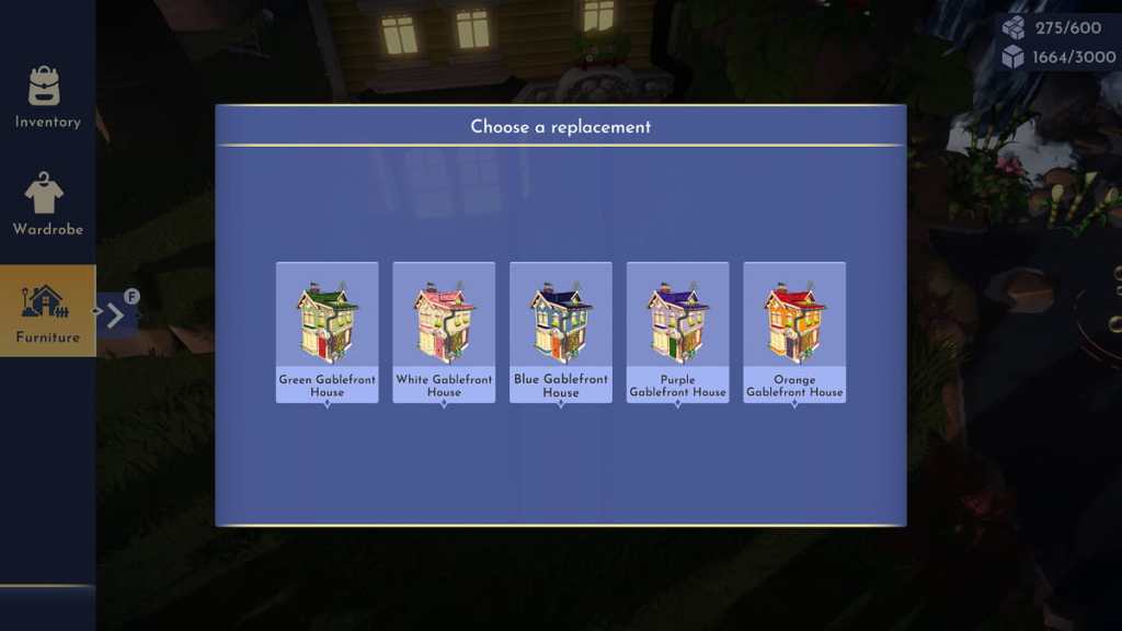 - Select your house with the cursor, press A, then choose the Replace option by pressing X. This opens up a menu with multiple different exterior options for your home.
