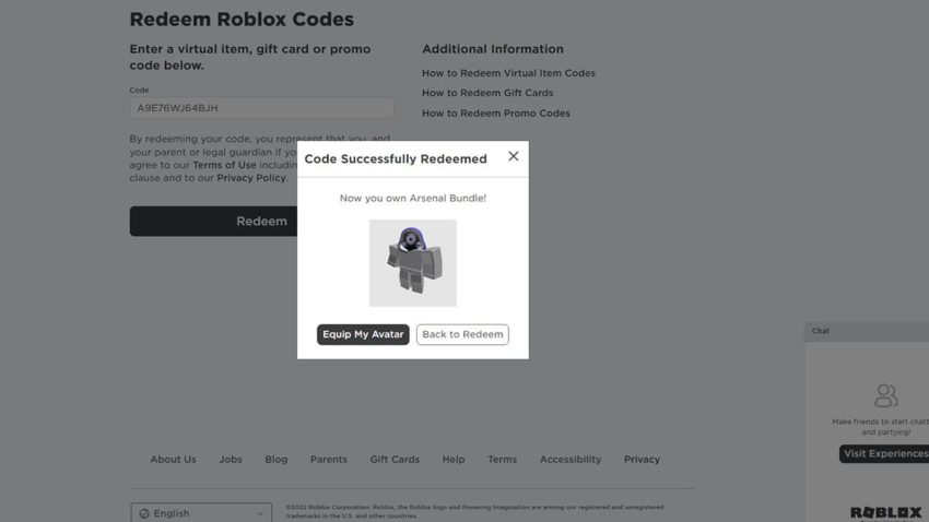 - Paste the code that you got from the reward into the white box and hit “Redeem.” If done successfully, you’ll get a pop-up saying that your code was successfully redeemed and that you can equip your new accessory.