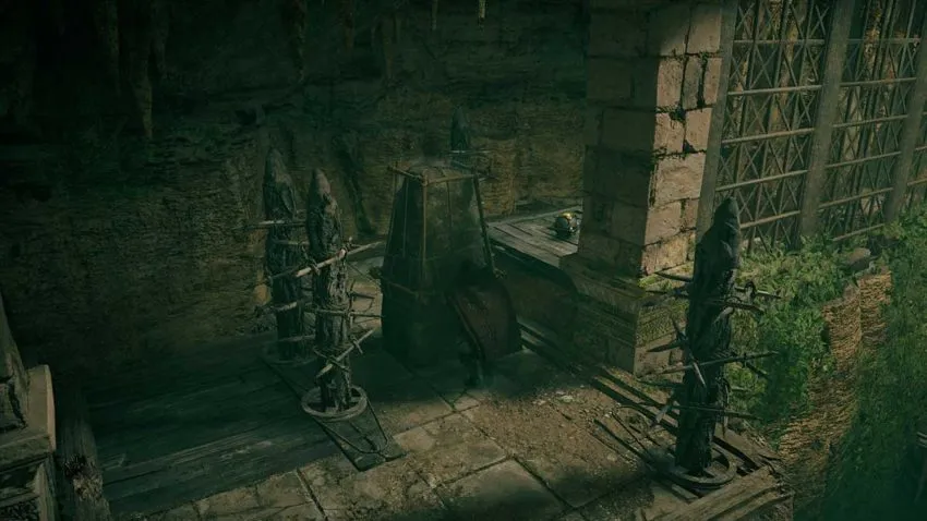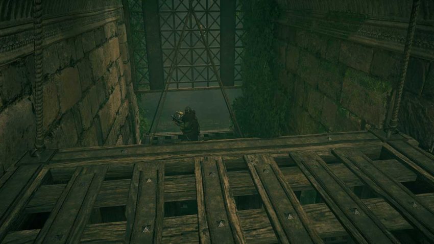 On the opposite side of the room, you need to climb up one set of scaffolding and shoot through some wooden flooring. Don’t drop down, though. Instead, climb up the next set of scaffolding and turn the crank at the top. This opens the gate below, meaning you can now drop into the hole left by the wooden flooring and drag the podium out and onto its pressure plate.