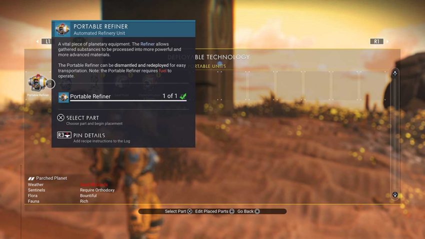 To complete this first Milestone, you need to get your ship ready to fly again. This requires you to repair all the systems, but you’ll need a Portable Refiner before you can do any of that. You should have one in your inventory, so open the build menu and place your Portable Refiner nearby.