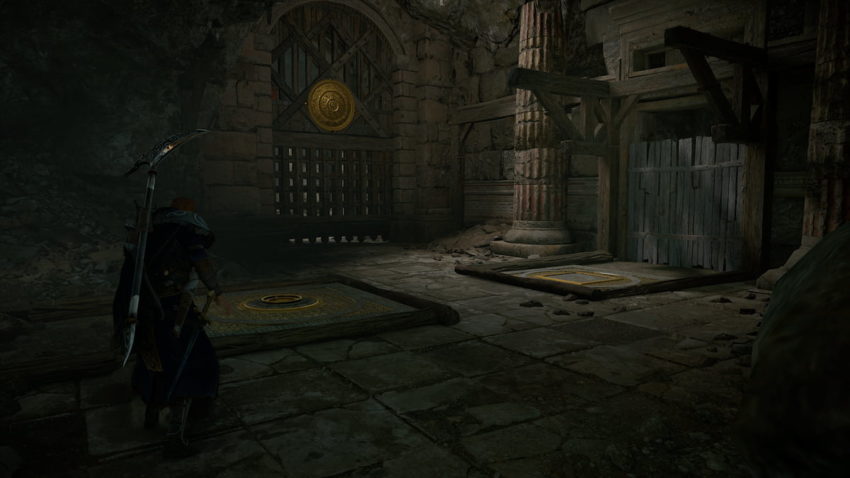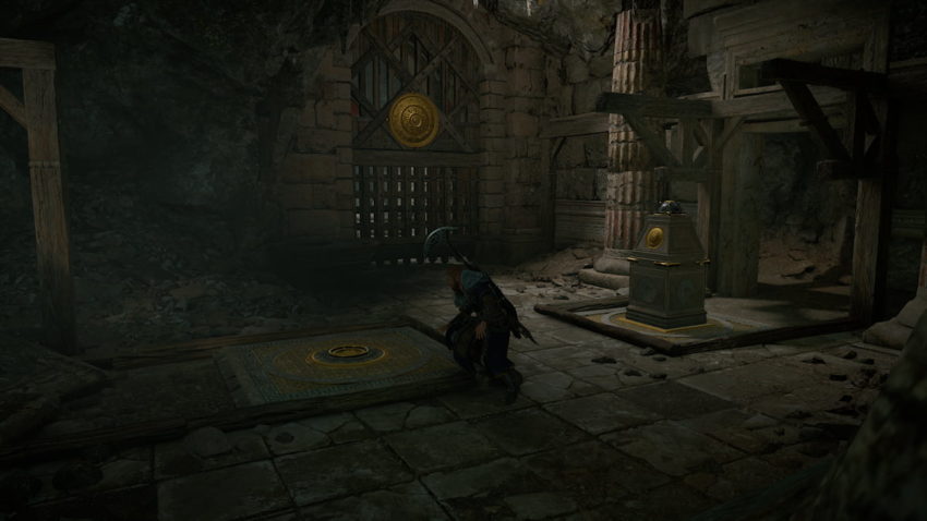 Scale the wall on the left side of the room, and you’ll find a large lever. Pull it, and a small ball appears on the ground. You’ll need to pick it up, bring it back to the center room, and place it on the second pressure plate. When you have both items on the pressure plate, the initial gate should open, allowing you access.