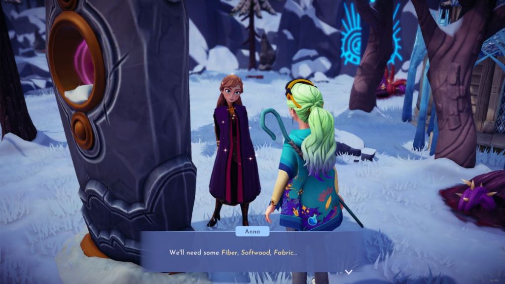 Softwood can be found in the Plaza and the Peaceful Meadow. Fiber is made using Seaweed which can be fished from the various bodies of water around the valley. Fabric is made from Cotton which can be grown from seeds purchased from Goofy’s Stall in the Sunlit Plateau. Finally, Donald’s Feathers can be found inside his home. Once you have all the items, bring them to Anna. Anna will craft the mask but it won’t fit. Bring the mask to Olaf.